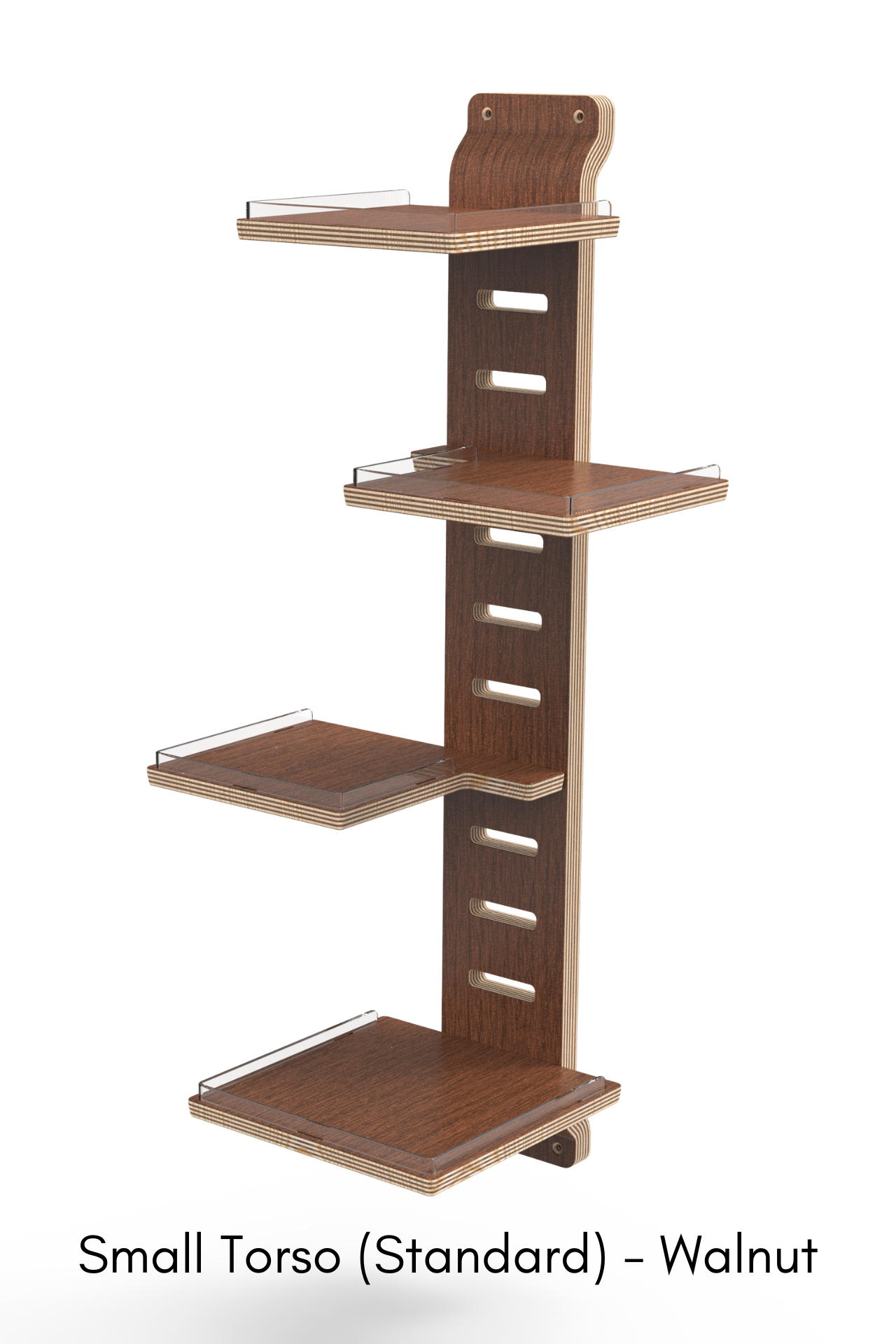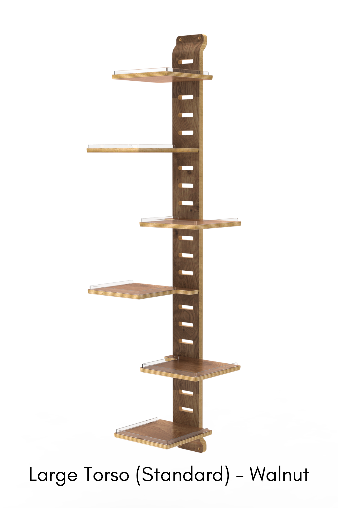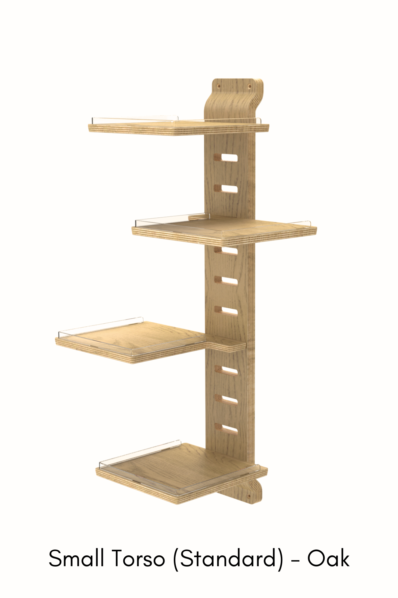 - Once the Torso is securely fastened to a wall surface, the shelves can be easily inserted into any of the slots by simply pushing them in.